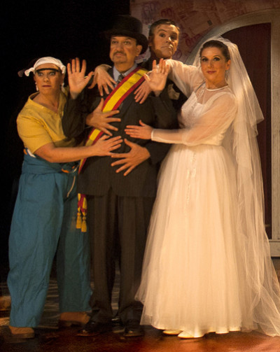 La música va ‘in crescendo’, apareixen de l’interior els banquers i les banqueres, ricament vestits, completament daurats, des del barret de copalta fins els cordons de les sabates i portant a la mà un maletí ple de….
